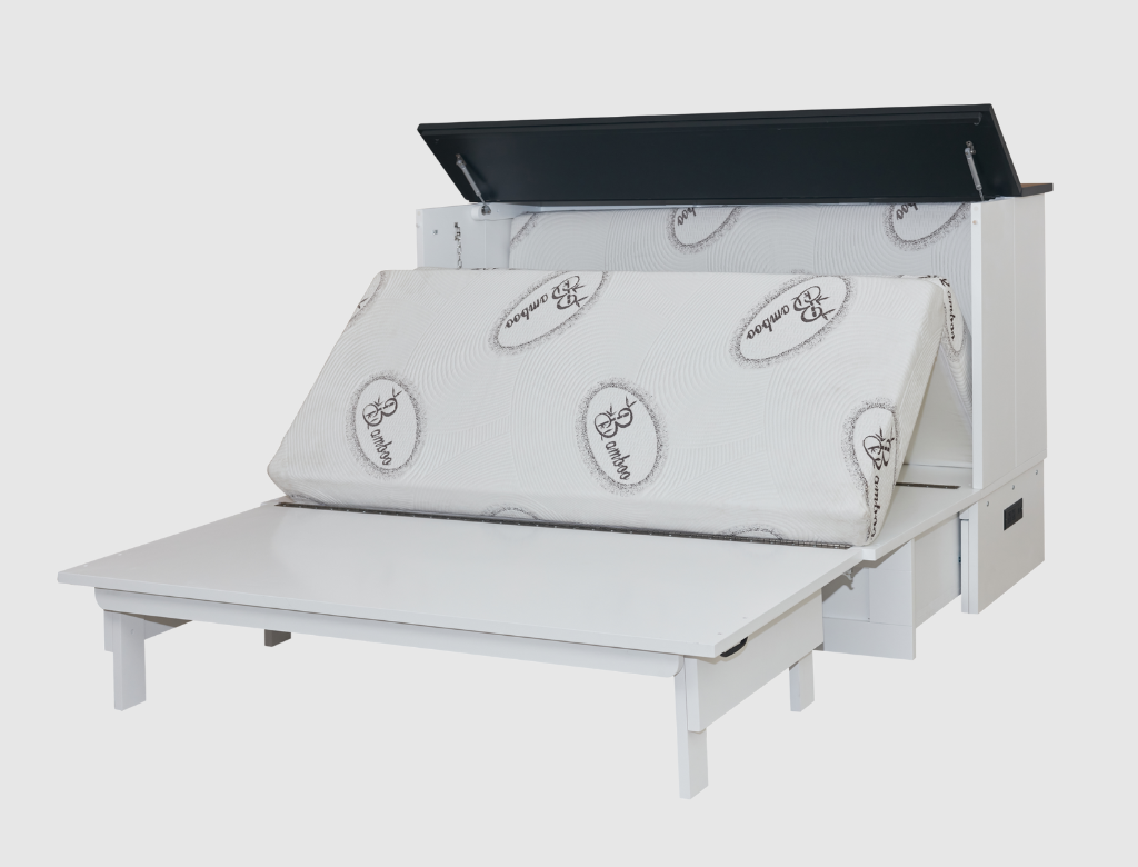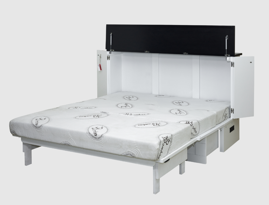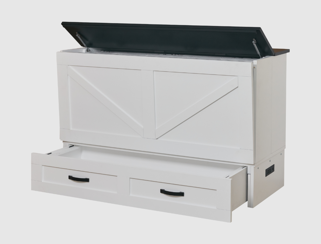 The Aztec is a free-standing CabinetBed that transforms into a full-size sleeping surface in under 30 seconds no wall mounting or permanent installation required. Its stylized grooved panels, clean lines, and side opening panels give it a modern barn-door look while keeping operation effortless for daily use.